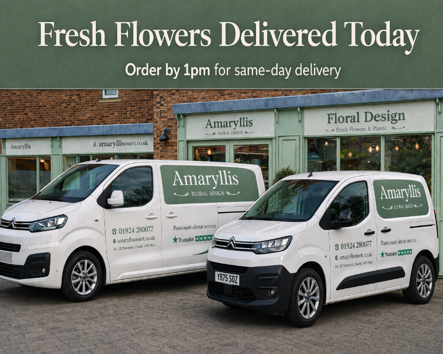 “Amaryllis Floral Design is rated as a 5 Star Trustpilot Florist with over 500 reviews based in Ossett, providing flower delivery in Wakefield and surrounding Towns..”