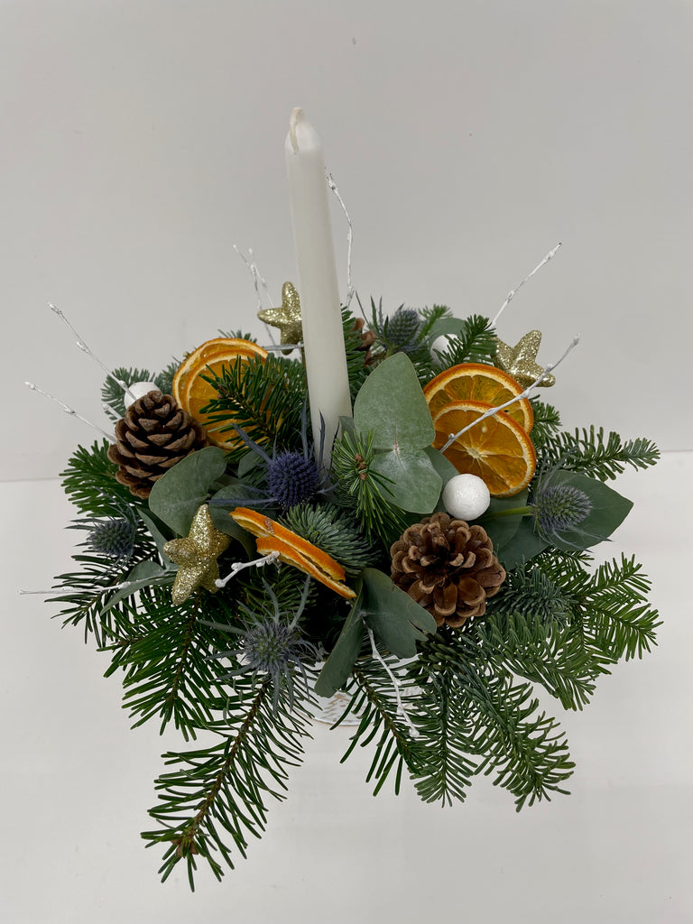 Individually made by one of our experienced florists, this beautiful candle arrangement supplied in a lovely festive Zinc Pot is the perfect choice for your Christmas table, or a thoughtful gift for family and friends over the festive period.