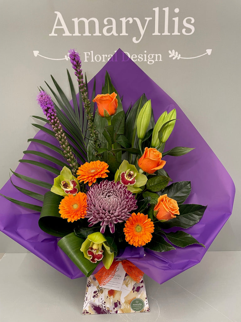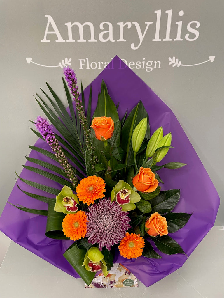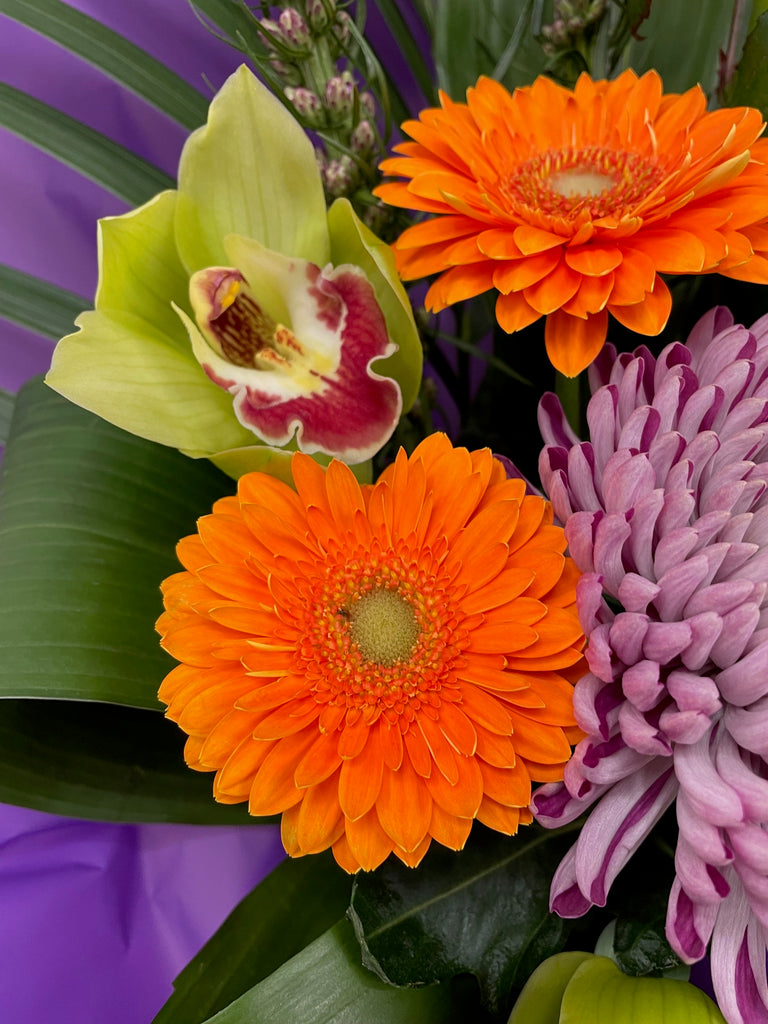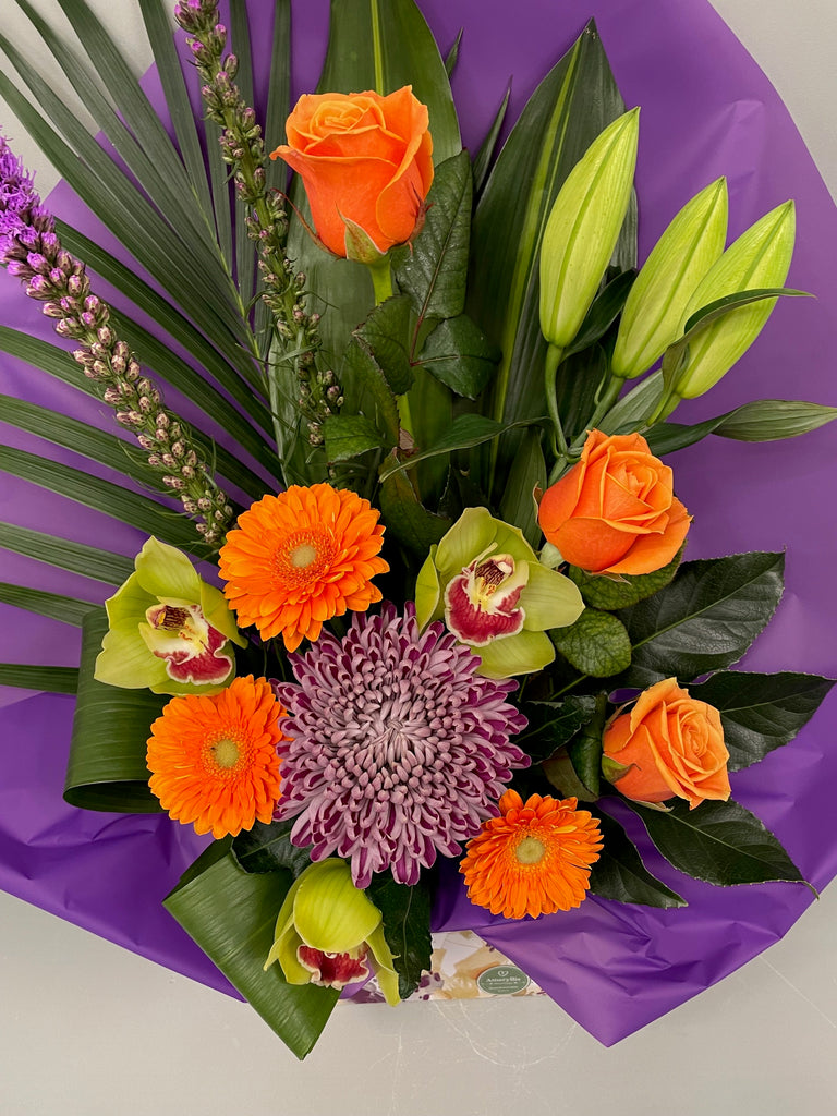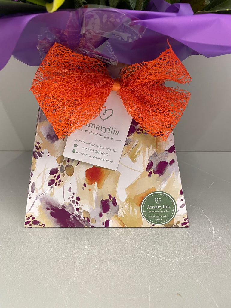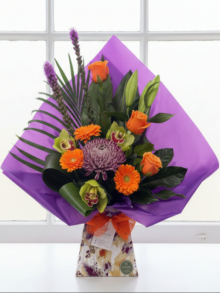 We have selected a range of flowers just for this service, which will be  individually made for each order by one of our trained florists. Images shown in this range are for example of the style and colours that we will make personal for your intended recipient prior to sending. This will ensure they receive the same fresh quality products, at the same great value as our local customers, without the need to visit us directly. Instead we'll carefully and securely box the bouquet, adding a small amount of water, ready for transportation. They'll arrive with clear instructions of what to do, and how to best to care for them, Simple!