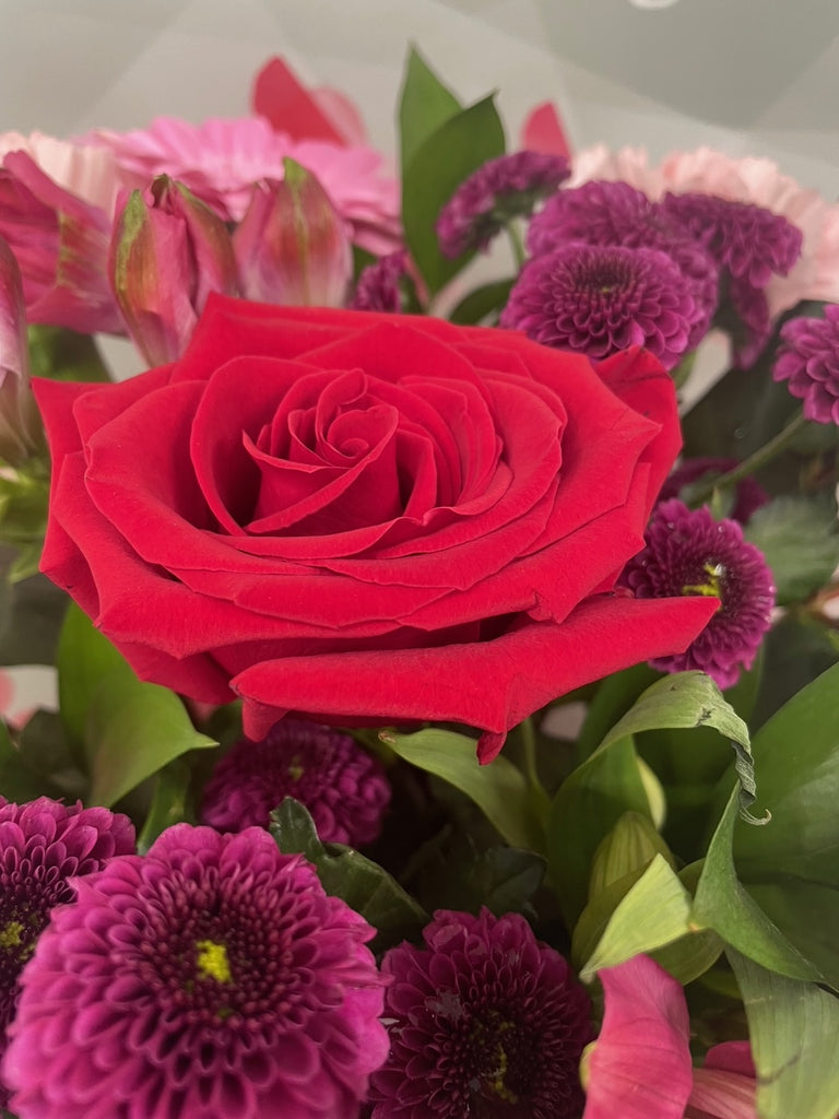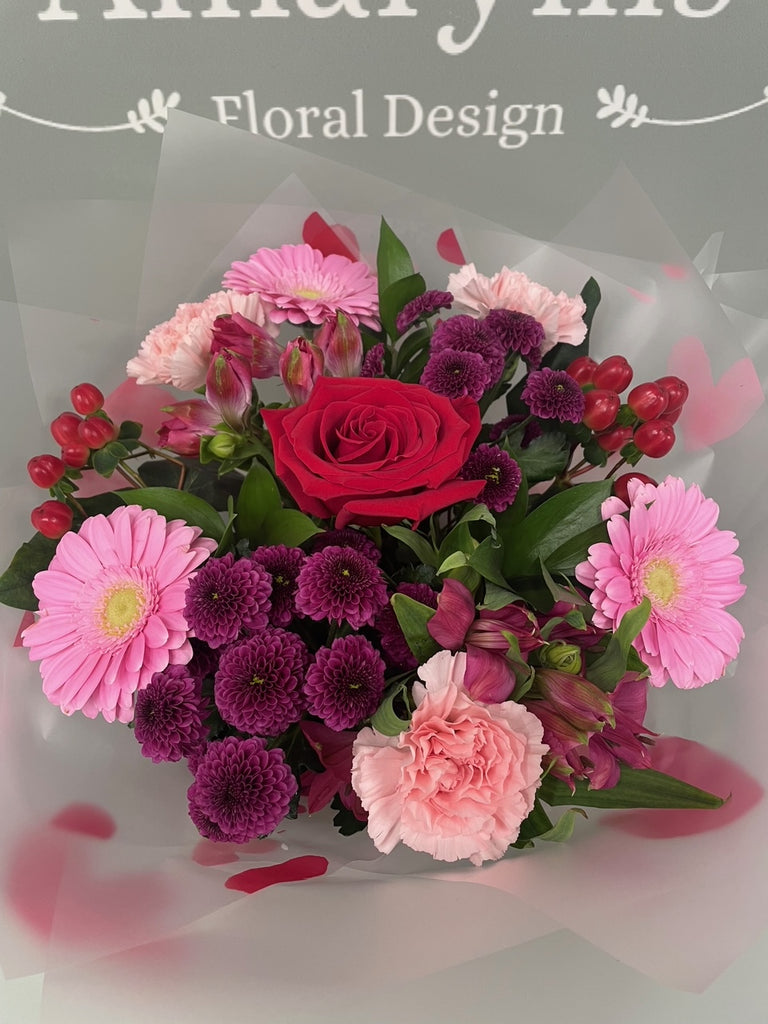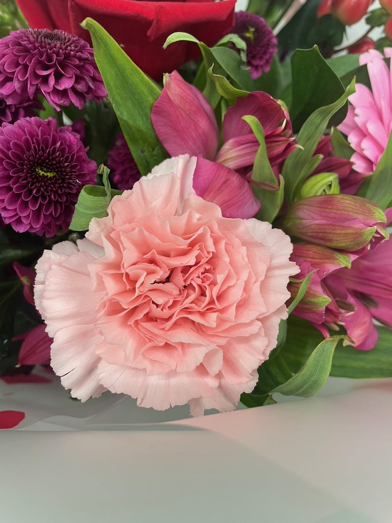 This is a beautiful bouquet, designed for that special valentine, using seasonal tones of deep red's and pale pinks with greenery and delivered in a soft deep Red gift bag with Red bow and brand tags.